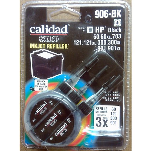 This cartridge is a little more difficult to refill. First you place sealing tape (supplied) over the printhead on the cartridge, then you remove the label on the top of the cartridge to expose the hole to refill your cartridge. After filling the cartridge with ink you will take the empty refilling bottle to squeeze air into the cartridge to activate it. PLEASE NOTE.. do not remove the label before buying one of our Calidad Refill Kits. This will allow air to enter the cartridge and will dry out the ink sponge. You will have great results with these refill kits if you follow these 3 simple rules: 1. Take your time. Don't get in a big hurry. 2. Follow the instructions exactly. 3. Take the cartridge straight out of the printer and refill it at that time. The cartridge will dry out quickly if left out of the printer. If the cartridge dries out you will not be able to refill it successfully. The refill kit is designed to work with HP 60, 60XL, 121, 121XL, 300, 300XL, 703, 901, and 901XL cartridges. These cartridges work in these printer models: HP Deskjet D1600, D1660, F2480, F2483, D2500, D2530, D2545, D2560, D2563, D2566, D2600, D2660, D2663, D2680, F4280, F4283, F4480, D5560, F5563, Officejet J4500, J4524, J4535, J4540, J4550, J4580, J4624, J4640, C4680, J4680, C4780, Photosmart D110a, C4680, and C4780.Black Ink Refill Kit for HP 60, 60XL, 121, 121XL, 300, 300XL, 703, 901, and 901XL Cartridges Feature